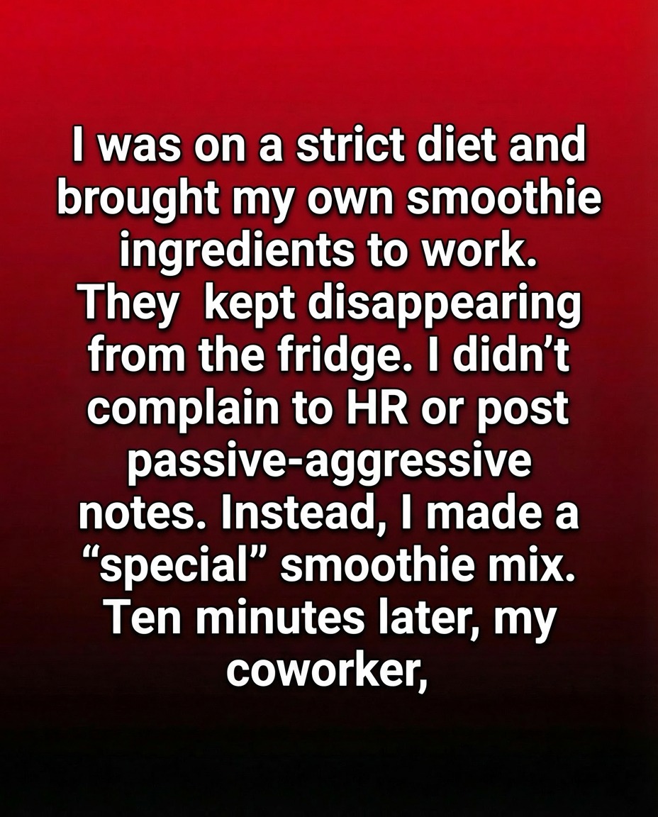 At first, it seemed like a small inconvenience. I had recently committed to a strict diet, waking up early each morning to prepare fresh smoothie ingredients—cut fruit, measured portions of yogurt, and carefully chosen supplements. I packed them neatly in containers and placed them in the office refrigerator, proud of my new routine. But within a week, items began disappearing. A missing banana here, an empty yogurt cup there. I told myself it was a mistake, that maybe I had forgotten something at home. Still, each vanished ingredient felt like a tiny crack in my motivation.