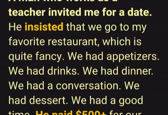 A woman went on a first date with a man who insisted on taking her to her favorite restaurant, which was very expensive—around $500 for dinner. She suggested a cheaper place, but he wanted the high-end spot, so she agreed.