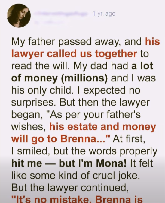 I thought my father’s will would secure my future. Then the lawyer read a name I didn’t recognize. My grandmother’s fury was immediate. Who was Brenna, and why did my father leave her everything? And what secret was behind it?