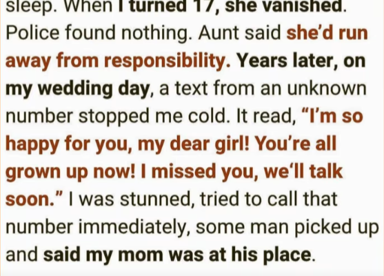 Years passed. I learned to live with the unanswered questions. Then, on my wedding day—when I was surrounded by love, family, and the promise of a new chapter—I received a text from an unknown number that froze me in place.