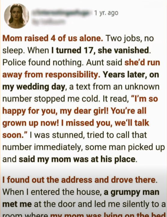Mom raised the four of us completely on her own. She worked two jobs, barely slept, and carried the weight of the world on her shoulders. I always admired her strength, but when I turned 17, everything changed. One day, she was just gone—vanished without a word.