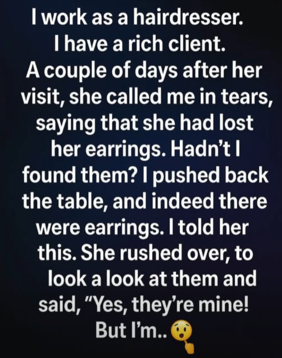I searched everywhere — under chairs, behind mirrors, even inside drawers. Finally, when I pushed back the small table near my styling station, something sparkled beneath it. There they were — two dazzling earrings, catching the light like tiny stars. Relieved, I called her immediately. Within minutes, she rushed in, her face a mix of hope and fear.