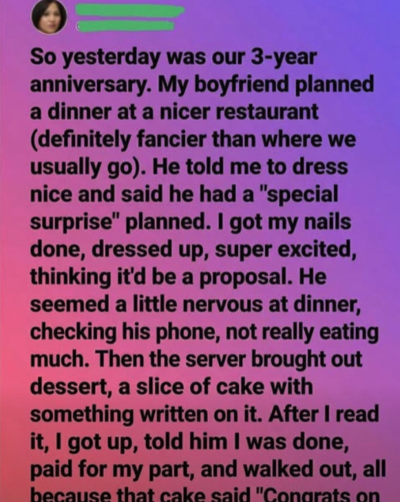 Throughout dinner, something felt slightly off. He checked his phone more than usual and barely touched his food, offering distracted smiles that didn’t quite reach his eyes. She tried to keep the mood light, reminiscing about their first date and the small moments that had defined their relationship. Still, an uneasy silence lingered between bites. When dessert arrived, the room seemed to pause. The server placed a single slice of cake in front of her, decorated with a short message written in careful lettering. She leaned forward, smiling at first, expecting a heartfelt surprise.