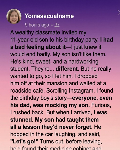 When my son came home with an invitation to a classmate’s birthday party, my first reaction was hesitation. The boy came from a wealthy family, the kind that lived in a mansion on the hill and posted every detail of their lives online. I had always sensed that my son felt out of place among some of his classmates, not because he lacked confidence, but because he was gentle, thoughtful, and more comfortable with books than bragging. Still, he wanted to attend, eager to be included. Against my instincts, I agreed, drove him to the grand house, and waited nearby at a small roadside café, telling myself that trust sometimes means letting go. While sipping coffee, I scrolled through social media and stumbled upon a story posted by the birthday boy. My heart sank.