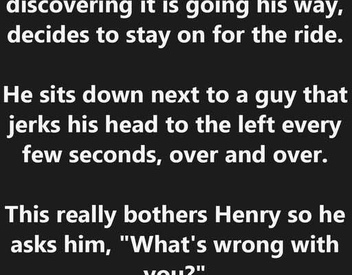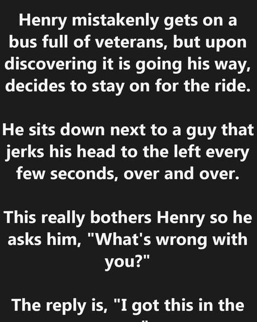 Henry mistakenly gets on a bus full of veterans, but upon discovering it is going his way, decides to stay on for the ride. He sits down next to a guy that jerks his head to the left every few seconds, over and over. This really bothers Henry so he asks him, “What’s wrong with you?”