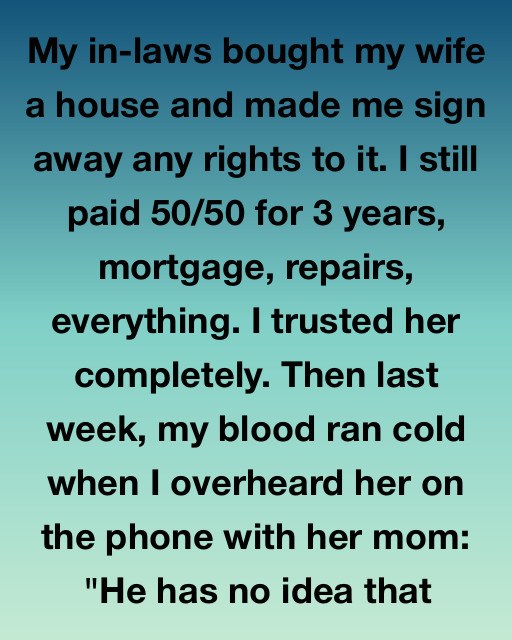My in-laws bought my wife a house and made me sign away any rights to it. I still paid 50/50 for 3 years, mortgage, repairs, everything. I trusted her completely because I believed marriage was a partnership of the heart, not just a legal contract.