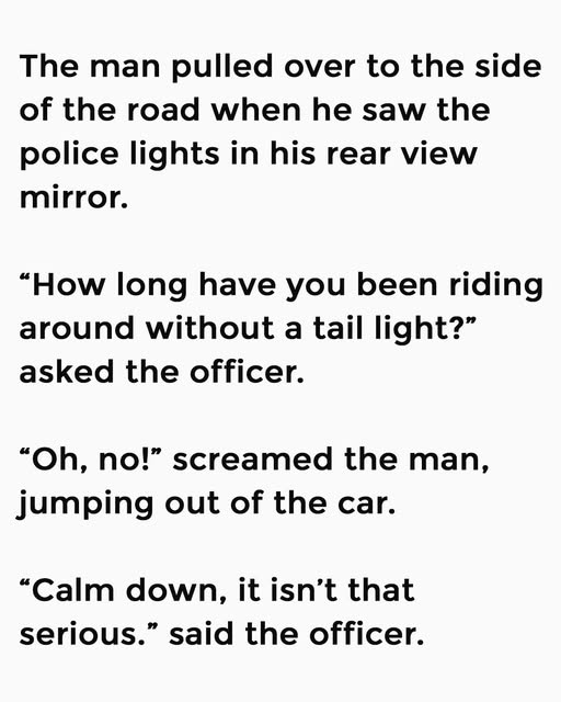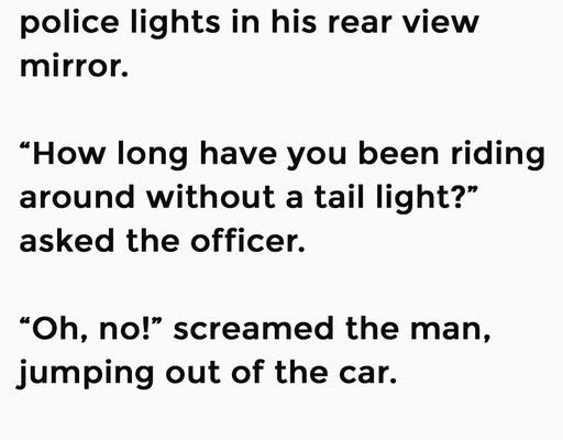 The man pulled over to the side of the road when he saw the police lights in his rear view mirror. “How long have you been riding around without a tail light?” asked the officer. “Oh, no!” screamed the man, jumping out of the car.