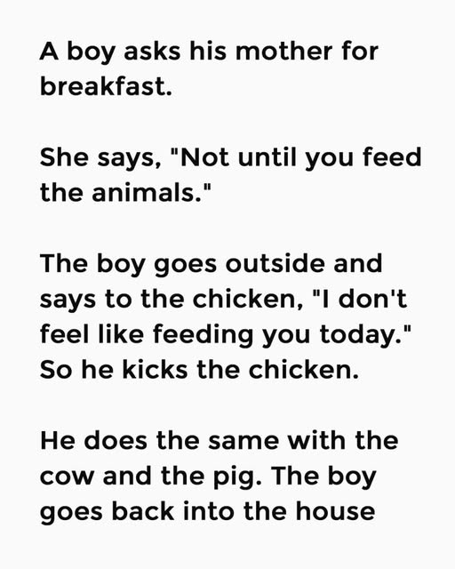 The boy goes outside and says to the chicken, “I don’t feel like feeding you today.” So he kicks the chicken. He does the same with the cow and the pig.