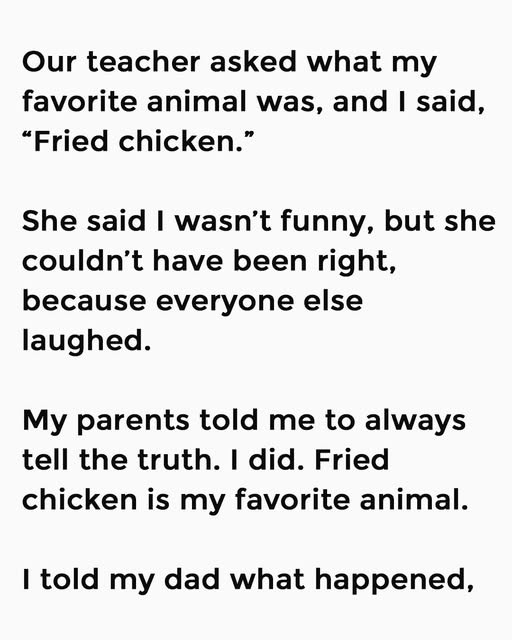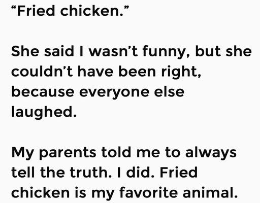 Our teacher asked what my favorite animal was, and I said, “Fried chicken.”