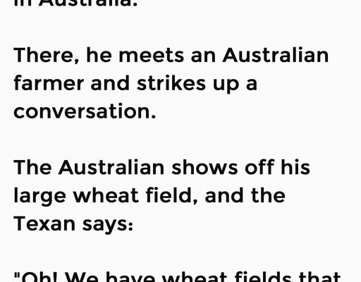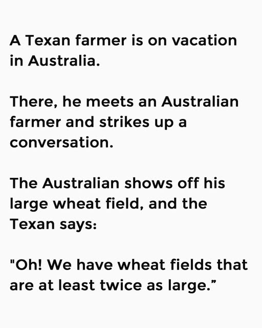 A Texan farmer is on vacation in Australia. There, he meets an Australian farmer and strikes up a conversation. The Australian shows off his large wheat field, and the Texan says: