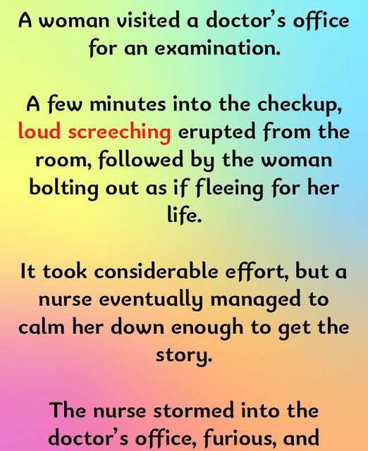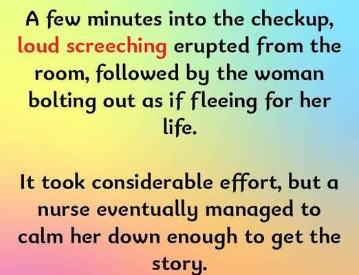 A woman visited a doctor’s office for an examination. A few minutes into the checkup, loud screeching erupted from the room, followed by the woman bolting out as if fleeing for her life. It took considerable effort, but a nurse eventually managed to calm her down enough to get the story.