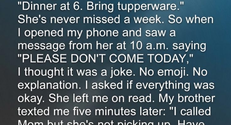 Every Sunday, my mom sends a message in the family group chat: “Dinner at 6. Bring tupperware.” She’s never missed a week. So when I opened my phone and saw a message from her at 10 a.m.