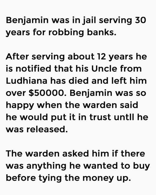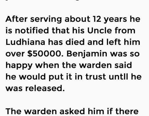 Benjamin was in jail serving 30 years for robbing banks. After serving about 12 years he is notified that his Uncle from Ludhiana has died and left him over $50000. Benjamin was so happy when the warden said he would put it in trust untll he was released.