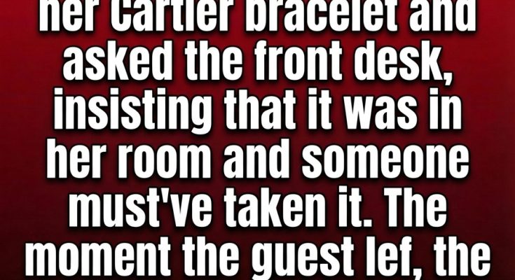 Lena had always loved working at the front desk of the grand Meridian Hotel. The marble floors gleamed under crystal chandeliers, and every guest expected perfection. One evening, a woman rushed toward the desk, visibly upset. She explained that she had lost her Cartier bracelet and was certain it had been left in her room. Her voice trembled as she insisted that someone must have taken it. Lena listened carefully, keeping her expression calm and professional while assuring the guest that the hotel would investigate immediately. Security was alerted, housekeeping was questioned, and records were reviewed, but no trace of the bracelet appeared. The guest eventually left, frustrated and suspicious, promising to contact management the next day.
