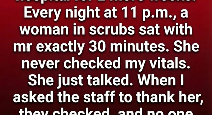 Every evening at exactly eleven, a woman in medical scrubs appeared beside my bed. She never rushed, never carried equipment, never checked monitors. Instead, she sat calmly and talked as if she had known me for years. She told gentle stories about small joys, about people who found strength when they thought they had none, about how life sometimes sends help in unexpected forms. Her voice was steady and warm, and somehow, I always felt safer when she was there.