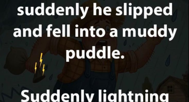 A farmer was running back home when it started to rain. Then suddenly he slipped and fell into a muddy puddle. Suddenly lightning flashed across the sky.