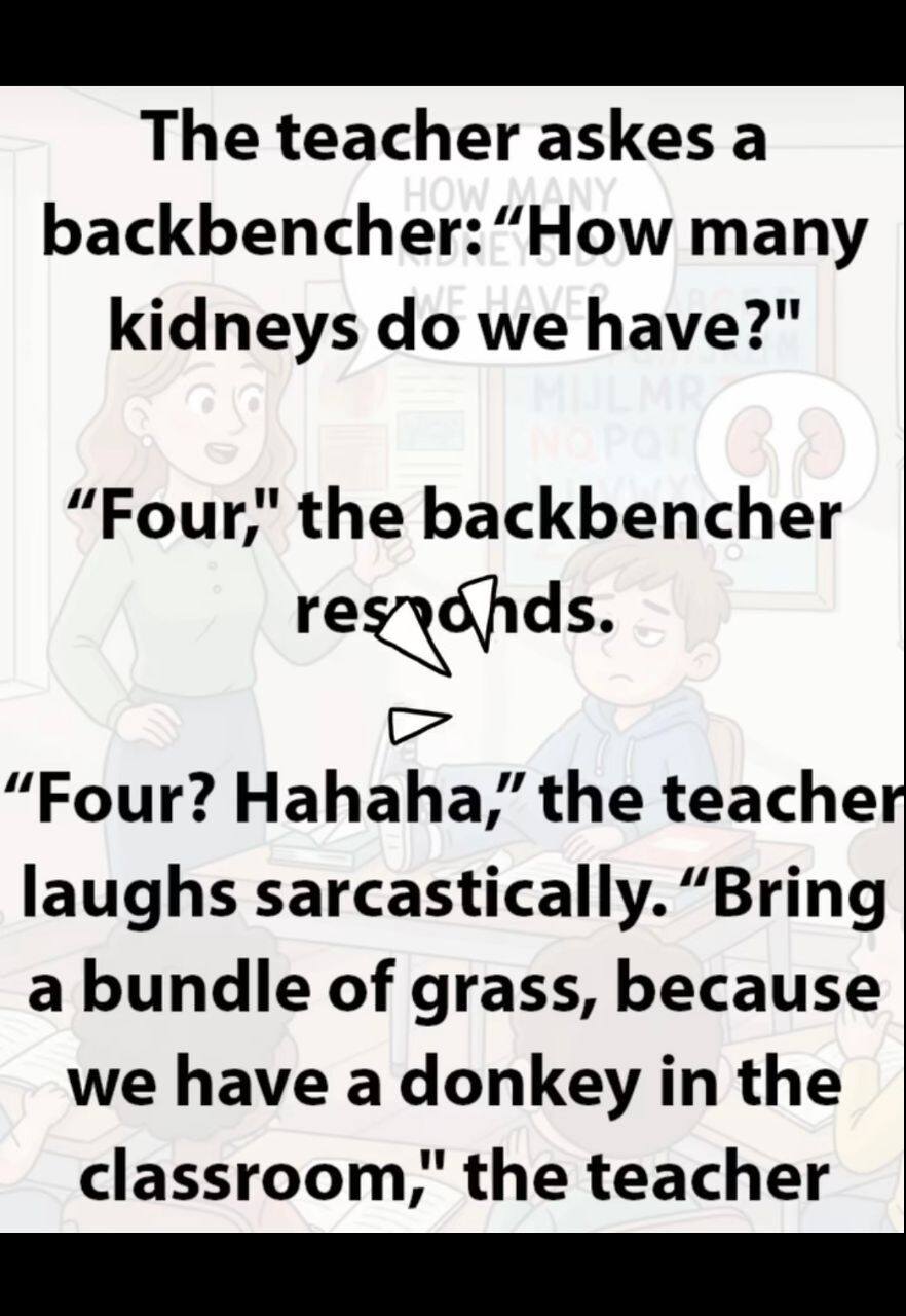 On his way out, the student still had the audacity to correct the furious teacher. “You asked me how many kidneys we have. We have four: two of mine and two of yours.