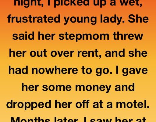 I’m a taxi driver. One rainy night, I picked up a young woman standing under a flickering neon sign, clutching a single bin bag. Her name was Mia, and through shivering sobs, she told me her stepmom had thrown her out over rent, leaving her with nowhere to go and just a few coins.I couldn’t leave her in the rain, so I drove her to a quiet motel and pressed the sixty pounds I’d made in tips into her hand, telling her it wasn’t a loan—just breathing room from one human to another. Months later, I saw Mia at the hospital during a routine check-up. She was in a crisp nursing uniform, vibrant and confident.