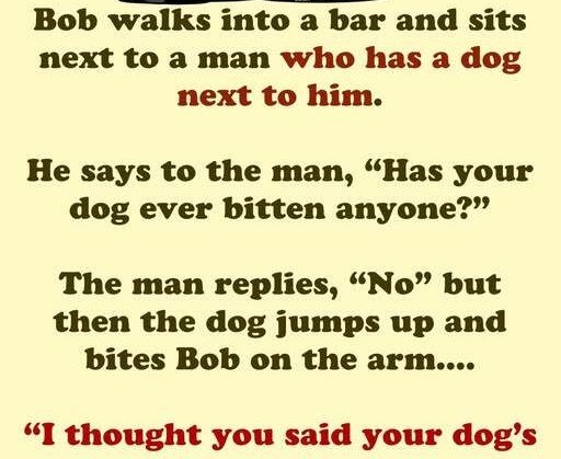 The man replies, “No” but then the dog jumps up and bites Bob on the arm. “I thought you said your dog’s never bitten anyone!” shouts Bob.