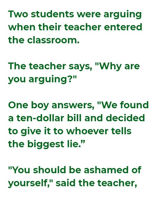 One boy answers, “We found a ten-dollar bill and decided to give it to whoever tells the biggest lie.”