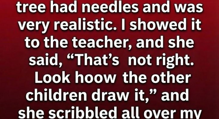 Instead, the teacher frowned. She held my paper beside another child’s and said mine was “wrong.” Then she uncapped her red pen and began correcting it—straightening branches, flattening texture, reshaping it into something safe and familiar. “Look how the other children drew it,” she said, as if creativity had rules.The classroom suddenly felt smaller, quieter, heavier. I wasn’t angry. I was confused.I looked around at the identical trees on the wall and wondered why mine wasn’t allowed to exist as it was. The red ink felt less like guidance and more like permission being taken away. I didn’t cry or argue.