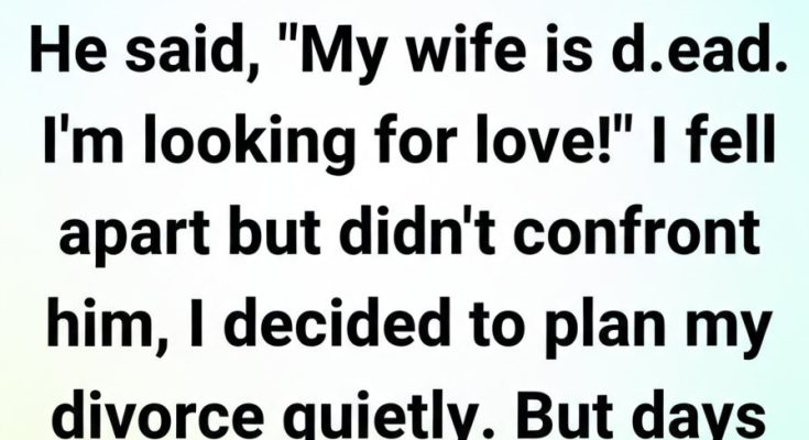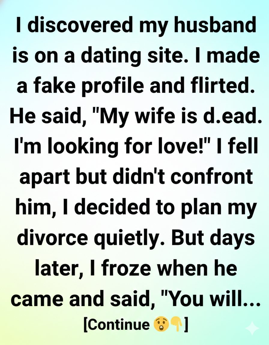 There it was: his profile, complete with messages to multiple women. My heart slammed against my ribs. My hands shook so hard I could barely scroll.And then I saw the worst message of all:“My wife is d.ead. I’m looking for love.”D.ead. My husband had declared me dead.Nine years of marriage flashed before me—our wedding vows, our inside jokes, every quiet morning coffee—and suddenly it all felt like a lie. I felt like I was disappearing inside my own home. But I didn’t confront him.Not yet. Something in me froze instead of exploded. The next morning, I quietly contacted a lawyer.I started planning an escape—changing passwords, checking finances, imagining a life without him. Meanwhile, I treated him coldly, barely speaking, barely looking at him. He seemed confused, but I didn’t care.