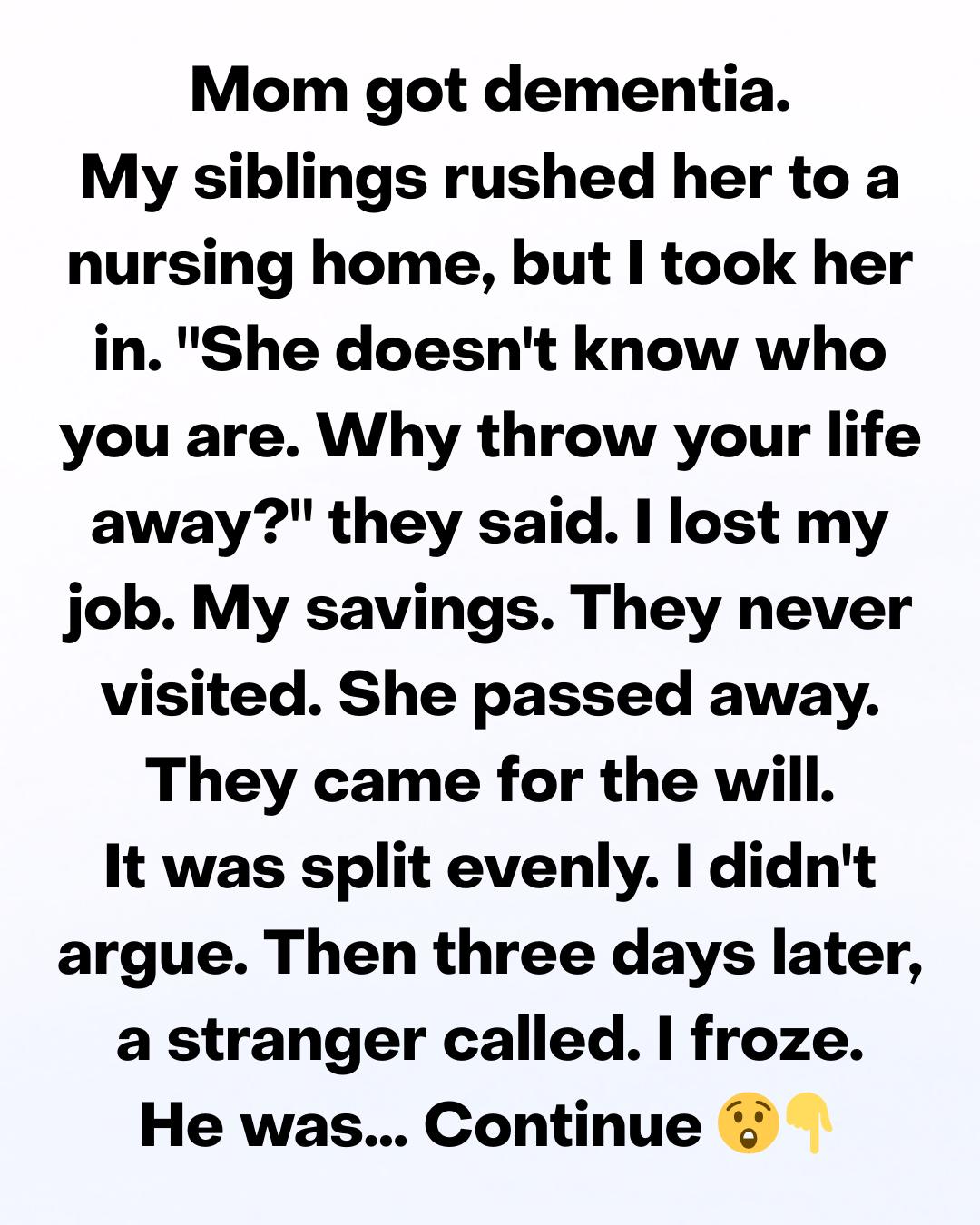 When my mom was diagnosed with dementia, my siblings reacted fast—efficient, decisive, distant. They found a nursing home within a week and spoke in the careful, clipped language of logistics. Costs.Availability. Liability. When I said I wanted to take her into my home, they stared at me like I’d volunteered to drown.“She doesn’t know who you are,” my brother said gently, as if that settled it. “Why throw your life away?” my sister added. I didn’t have a clever answer.I just knew that when Mom looked at me—confused, frightened, searching—she reached for my hand. So I brought her home. The next two years erased the life I’d been building.