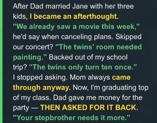When I asked Dad for help paying for a school trip, he agreed at first but later said he needed the money for his stepchildren’s birthday celebration. That moment made it clear where I stood.