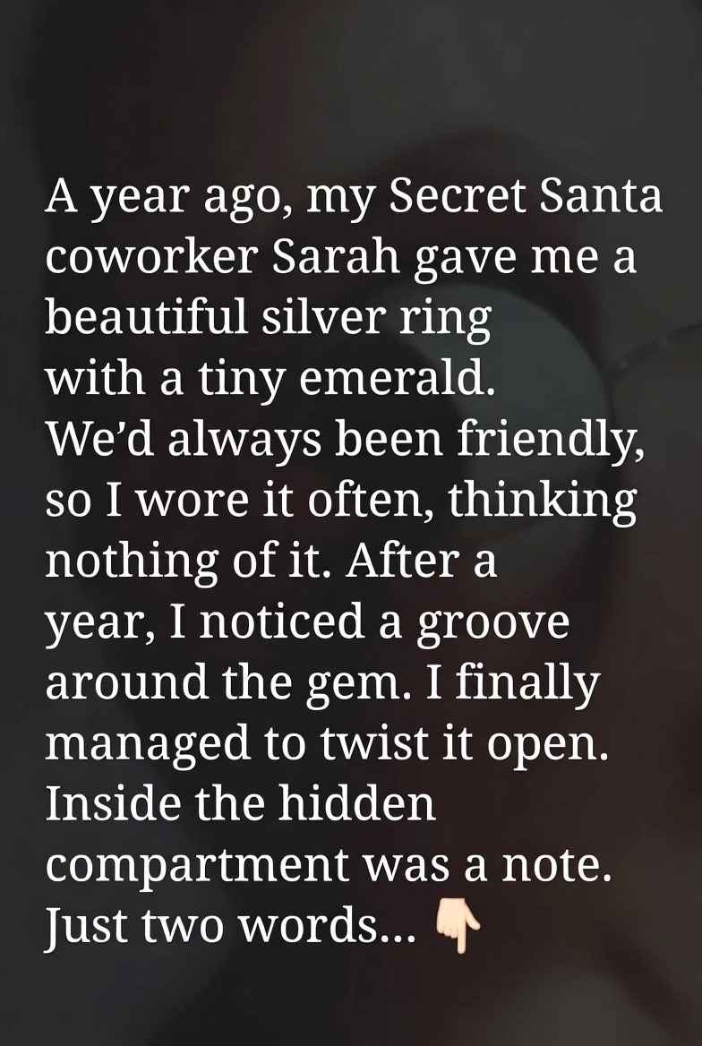 A year ago, my Secret Santa coworker Sarah gave me a beautiful silver ring with a tiny emerald. We’d always been friendly, so I wore it often, thinking nothing of it. After a year, I noticed a groove around the gem.I finally managed to twist it open.Inside the hidden compartment was a note. Just two words—”Keep going.”At first, I didn’t understand.Why would she hide a message like that? I asked Sarah about it, but she simply smiled and said, “Some words are meant to find us when we need them most.” I laughed it off, but those words stayed in my head, lingering quietly in the background of my thoughts.