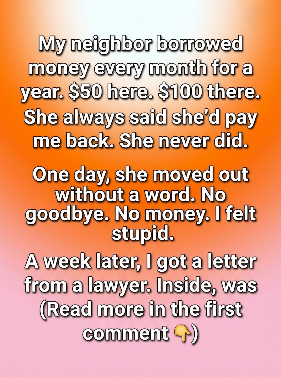 When Lena moved into the small apartment next door, she seemed like anyone else trying to get back on her feet. She was polite, quiet, and always apologized when she knocked on my door asking for a little help. At first, it was small amounts — fifty dollars to cover groceries before payday, a bit more when her car needed repairs so she wouldn’t lose her job. Each time, she promised to pay me back soon. I believed her because she never asked for anything extravagant, only what she needed to keep moving forward. Over time, the loans added up, but I kept telling myself that helping a neighbor was simply the decent thing to do.