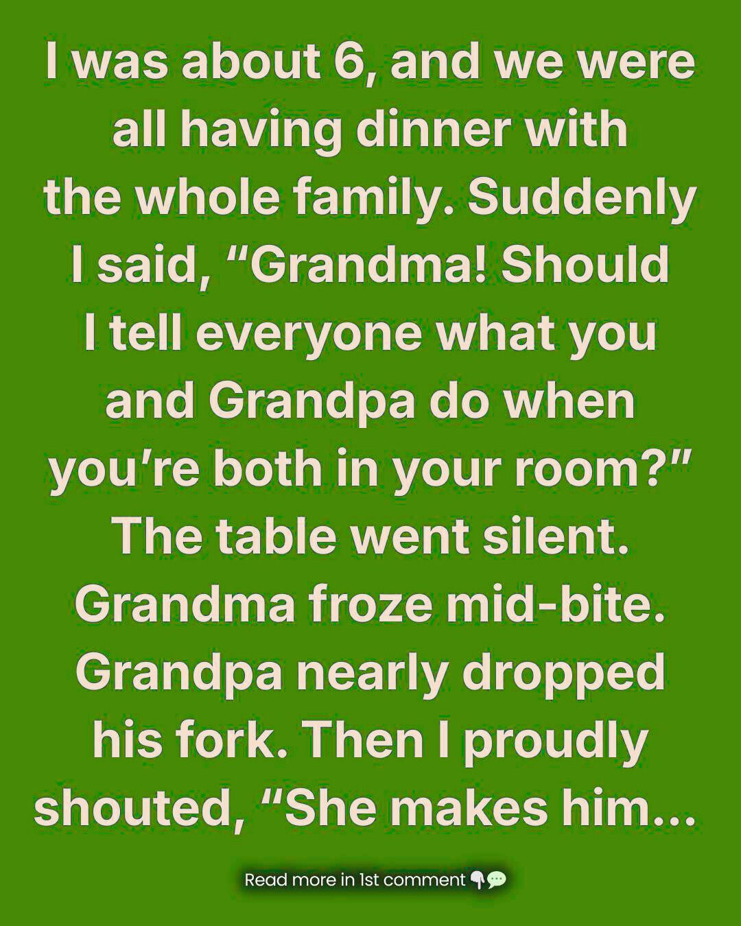 Grandma froze mid-bite, fork suspended in the air like it was afraid to move. Grandpa stared at me with the expression of a man who had just seen his entire life flash before his eyes. My mom choked on her water, and my dad whispered under his breath: