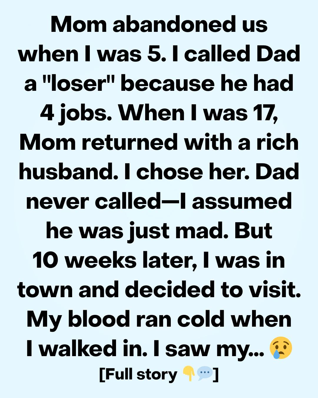 I ran to the hospital. When I saw him, tubes everywhere, face pale and thinner than I remembered, my knees nearly gave out. I broke down, sobbing, begging him to forgive me for leaving.