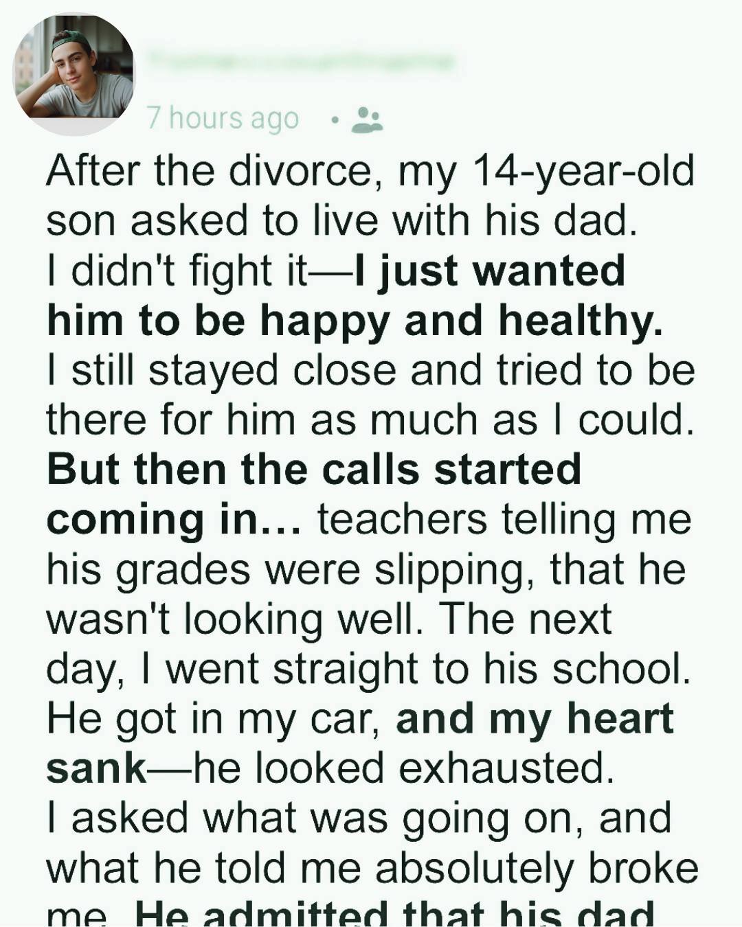 When my 14-year-old son, Mason, told me he wanted to live with his dad after the divorce, I said yes. Not because my heart agreed—if it were up to me, I’d have kept him under my roof, under my eyes, under my wing forever—but because I didn’t want to be the mother who stood between a boy and his father. Eddie was trying again.