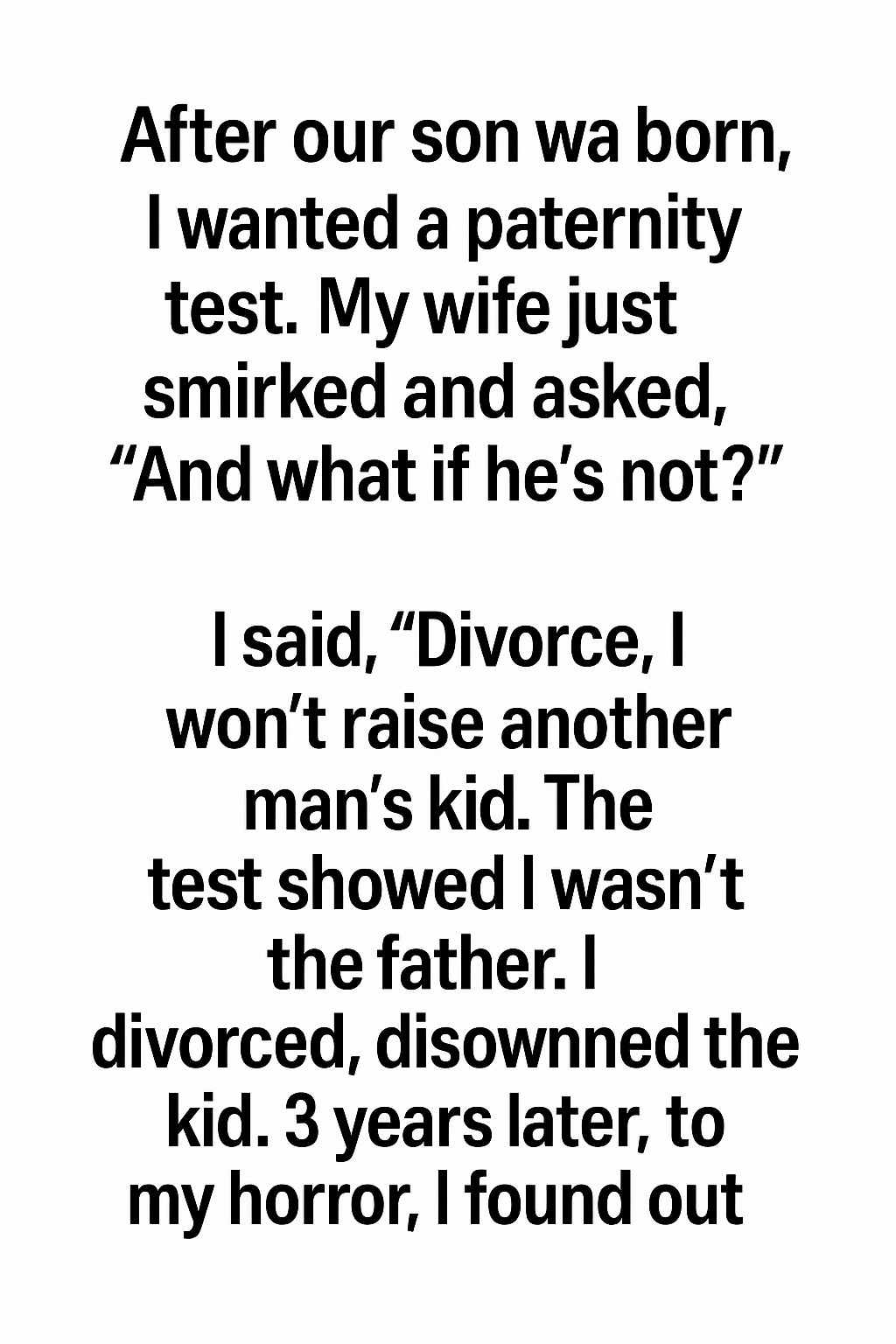 I said, “Then I’m gone.”The test confirmed my worst fear — I wasn’t the father. I walked away, heart numb.3 years later, to my horror, I found out. Three years later, I ran into an old family friend who looked at me with disappointment. He quietly asked why I had left my wife and child so suddenly.When I explained, his face fell. He told me something I never expected — my wife had been hurt by my suspicion, and that smirk I saw wasn’t arrogance, but shock and fear. She hadn’t cheated.