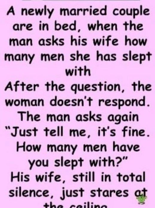 A newlywed couple lies in bed, and the husband curiously asks his wife about the number of men she has been with. Despite his inquiry, the woman remains silent, her gaze fixed on the ceiling. Pressing the matter, the husband asks again, assuring her, “Just share it with me, it’s okay.How many men have you been with?” Still met with silence, the wife’s eyes remain fixed above. Realizing his words may have caused discomfort, the husband offers an apology, saying, “I’m sorry, I didn’t mean to upset you. I simply thought we could have an open and trusting relationship…”Yet, his wife continues to maintain her silence.