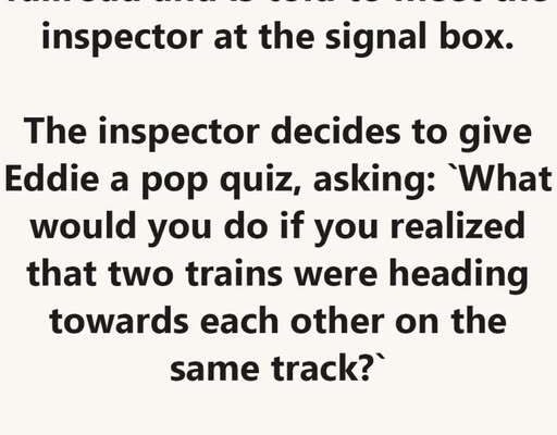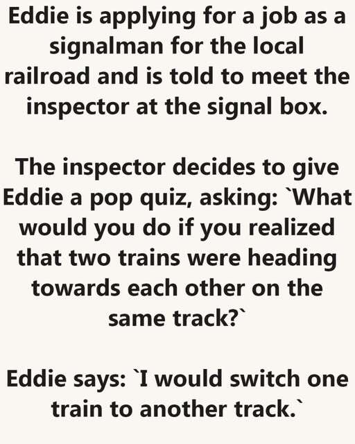 Eddie is applying for a job as a signalman for the local railroad and is told to meet the inspector at the signal box. The inspector decides to give Eddie a pop quiz, asking: `What would you do if you realized that two trains were heading towards each other on the same track?`Eddie says: `I would switch one train to another track.“What if the lever broke?` asks the inspector. `Then I`d run down to the tracks and use the manual lever down there`, answers Eddie.`What if that had been struck by lightning?` challenges the inspector. `Then,` Eddie continued, `I`d run back up here and use the phone to call the next signal box.“What if the phone was busy?“In that case,` Eddie argued, `I`d run to the street level and use the public phone near the station`. `What if that had been vandalized?`