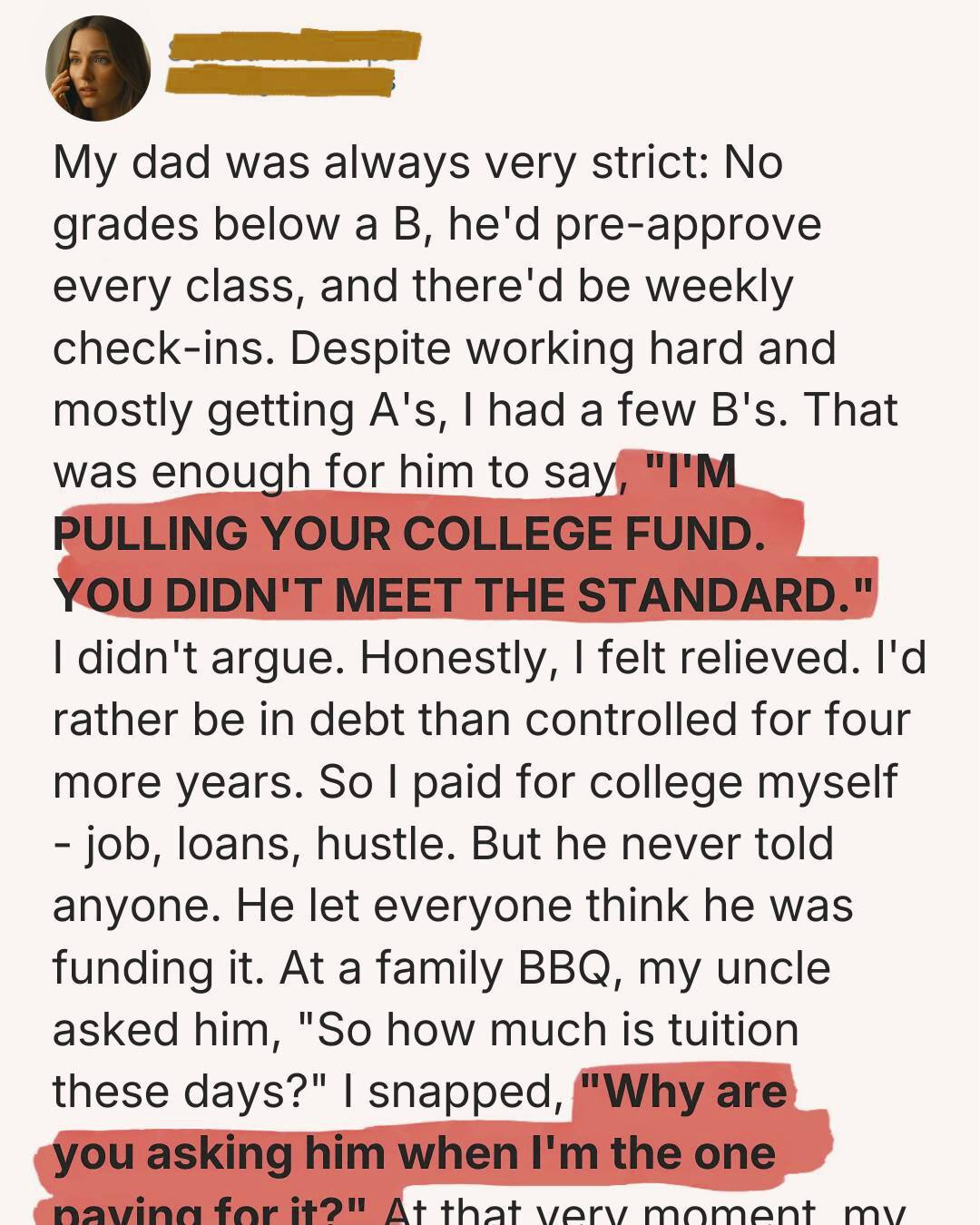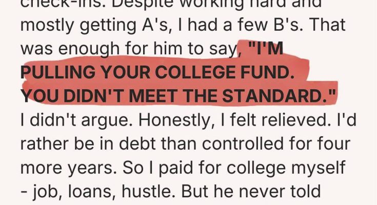 In middle school, he searched my backpack after dinner like he was looking for contraband. In high school, he emailed teachers if grades weren’t posted fast enough. Once, he forwarded me a screenshot of my portal with a single B circled.