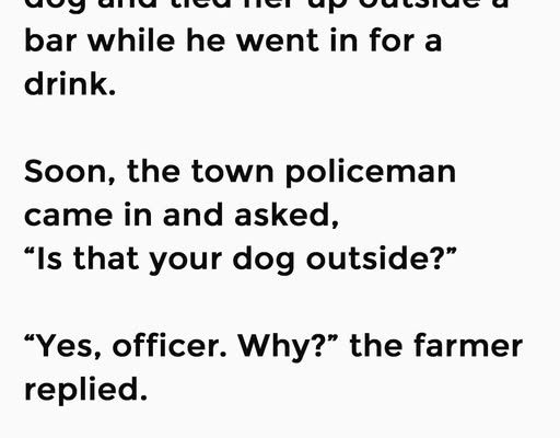 A farmer went to town with his dog and tied her up outside a bar while he went in for a drink. Soon, the town policeman came in and asked,