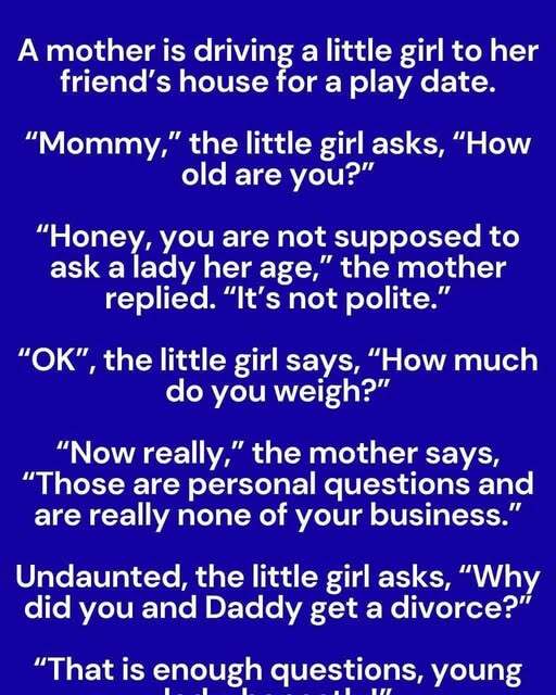 A mother is driving her little girl to her friend’s house for a play date. “Mommy,” the little girl asks, “how old are you?”