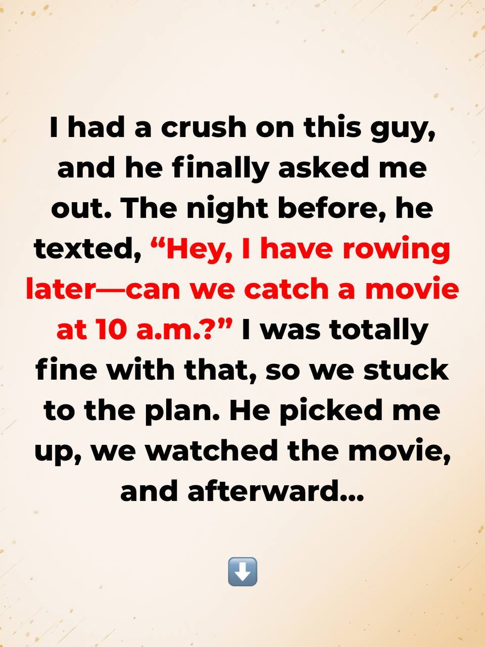 - An all-day date.Back when I was in high school, I had a crush on this guy for a few months, and he finally asked me out. He texted me the night before and said, “Hey, I have rowing later in the day. Can we do a movie at like 10am?” I was totally fine with it, so that was our plan.