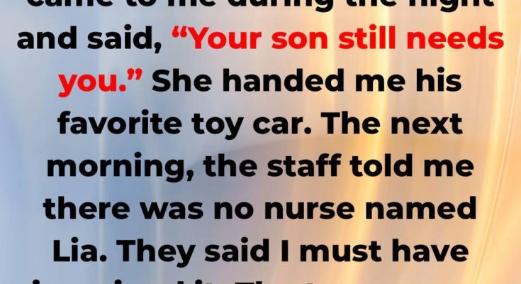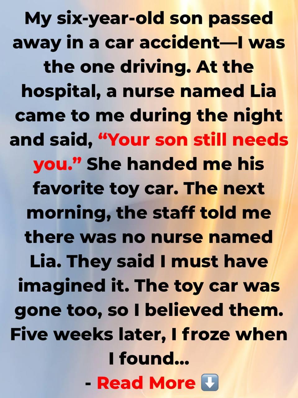 - My son, 6, died because of me; I was driving.At the hospital, a nurse named Lia came at night; she said, “Mothers don’t give up! Your son still needs you!” She gave me his favorite toy car, the one that was with him the day of the accident.