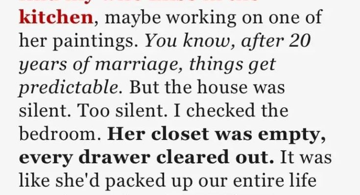 She had ended our 20-year marriage overnight, but the true shock came with her explanation.Two decades together had taught me the rhythms of our life—like the soft gurgle of the coffee maker at 6:30 a.m., the quiet click of the front door when I left for work, and the soothing sound of Elise’s voice sharing her day when I returned.