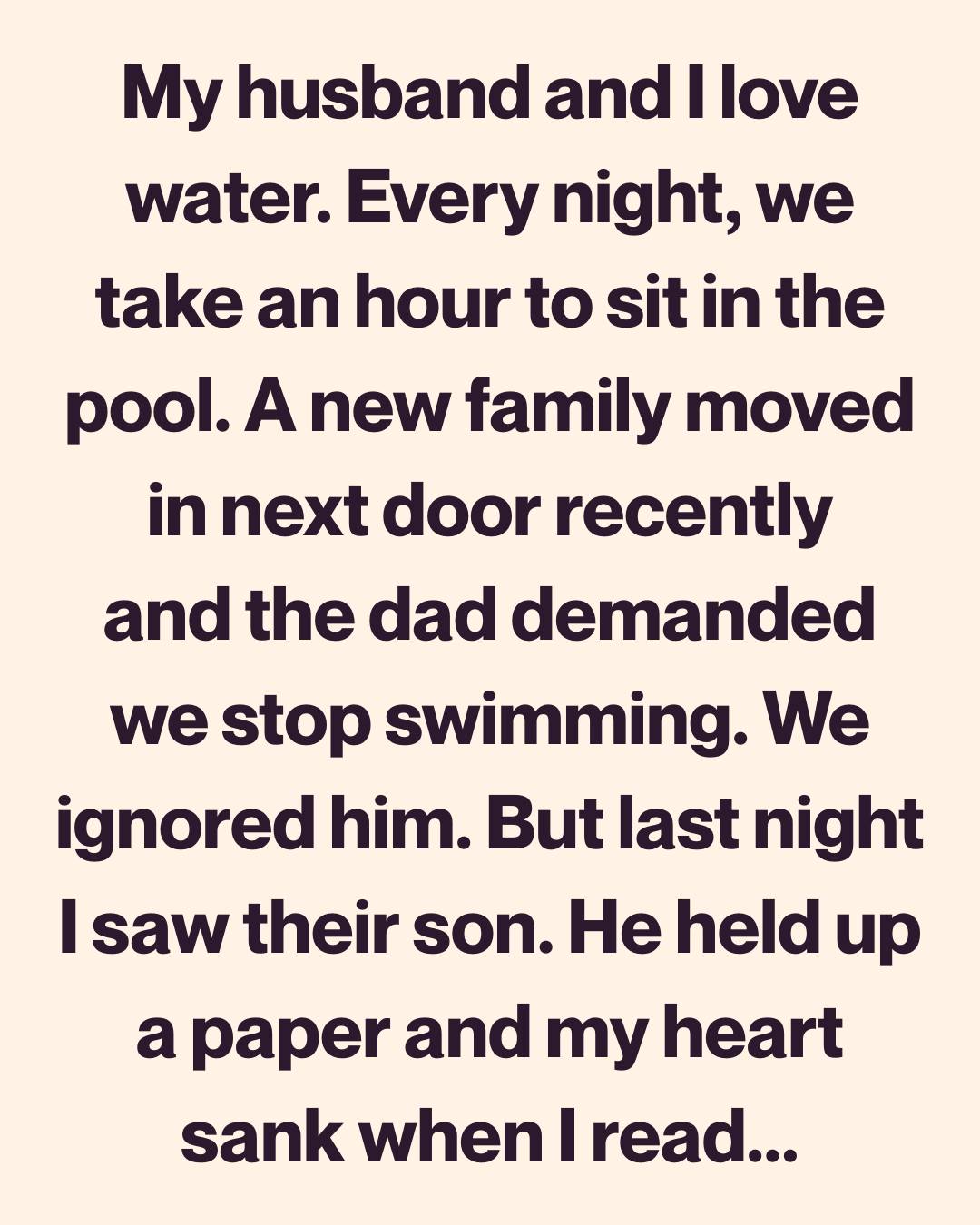 My husband and I had always found a special kind of peace in water. Each evening, when the world finally quieted and the day loosened its hold on us, we would slip into our backyard pool. There was no music, no splashing—only the gentle ripple of water against the tiles and the soft, unhurried sound of our voices.