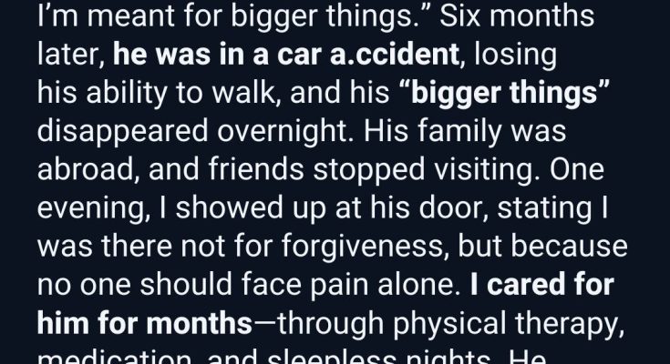 Six months later, I heard he’d been in a car accident. He survived—but barely. He couldn’t walk.