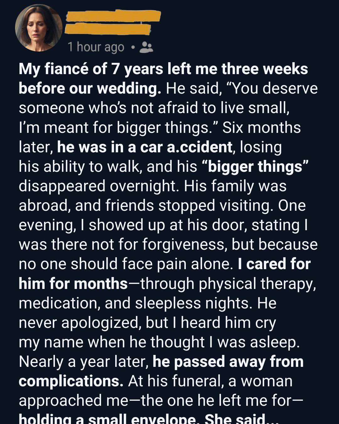 Her face stopped me cold. She was the woman he’d left me for. She stood there holding a small envelope, her hands trembling.