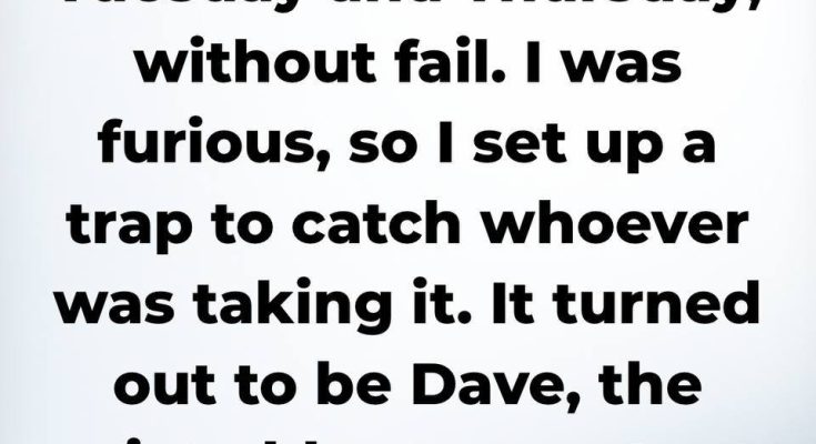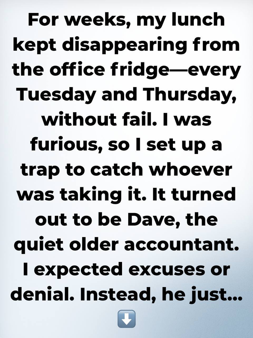 - For weeks, someone kept taking my lunch from the office fridge.Like clockwork, every Tuesday and Thursday, my lunch would disappear before I could get to it. I was furious and set a trap to catch the offender. It was Dave, a quiet older accountant on the team.