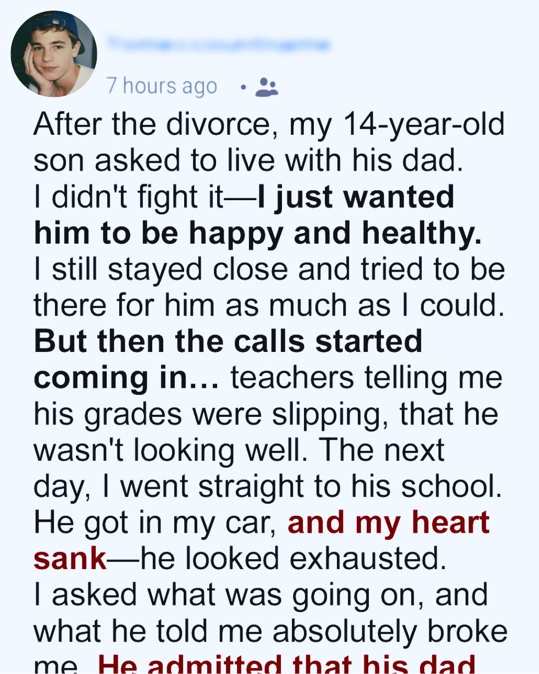 When my 14-year-old son, Mason, asked to live with his dad after the divorce, I agreed. Not because I wanted to—truthfully, I would have kept him with me every day if I could—but because I didn’t want to stand in the way of a father and son trying to reconnect. I still had weekends with him and could see him whenever he wanted.