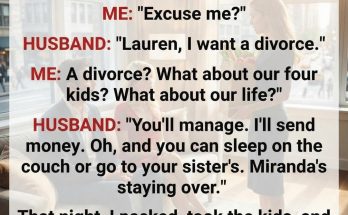 ME: “A divorce? What about our four kids? What about our life?” HUSBAND: “You’ll manage. I’ll send money. Oh, and you can sleep on the couch or go to your sister’s. Miranda’s staying …